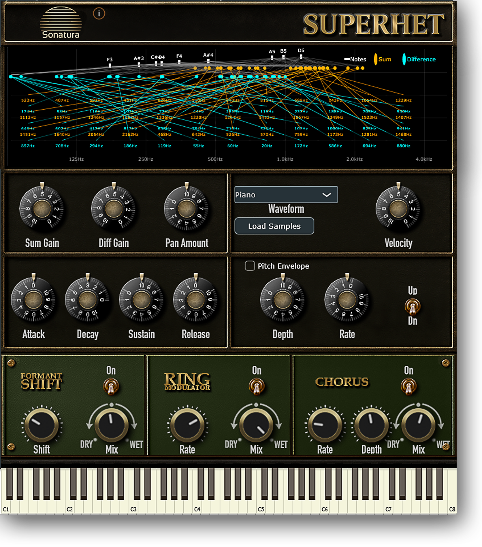 While the new frequencies are obviously exactly calculable, they seem somewhat random until you’re used to the process. Superhet allows you to create heterodyned frequencies using only a MIDI keyboard, and also includes a switchable pitch envelope, and ADSR controls for amplitude.